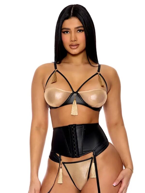 3-piece metallic mesh bra and hook and eye waist cincher with garters and matching panty with contrast faux leather and lace-up detail and gold fringe tassel embellishments.